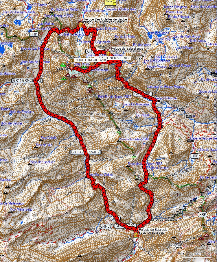 El recorrido atravesó el Valle de Ara, llegando al collado del Pto. de los Mulos (pasando a Francia) y haciendo noche en el Refugio de Oullet de Gaube (junto al Glaciar de Oullet y Glaciar del Petit Vignemale).